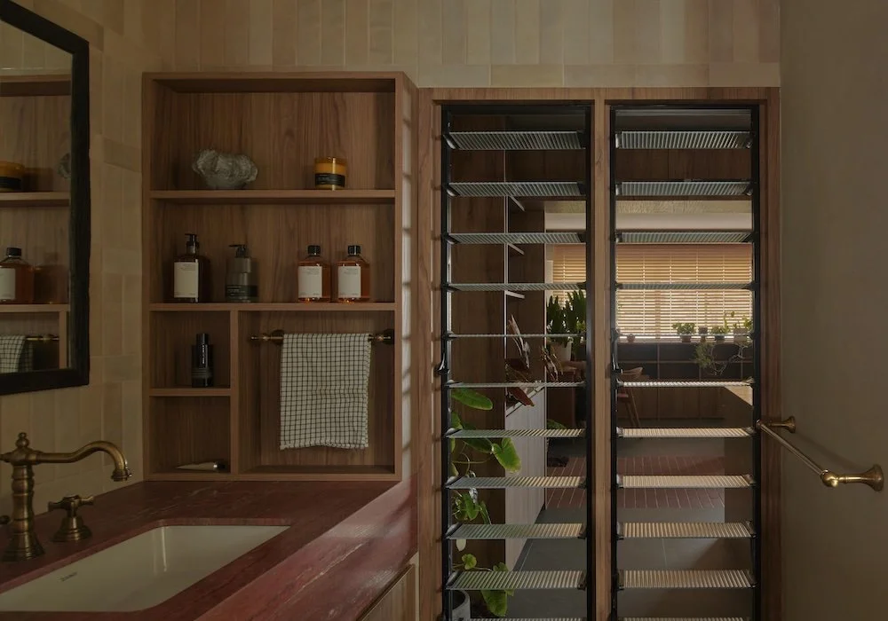 Rather than treating plants as ornaments, L Architects set out to make greenery part of everyday movement and routine. They distilled the idea into something I find profoundly Singaporean: an interior that borrows the spatial logic of a park. In public parks across the city, there is a memorable detail that often goes unnoticed — the double-bullnose brick. Once ubiquitous around benches, planter edges and walkways, these rounded bricks carry a softness and a history that modern materials tend to erase. Reintroducing that brick within a domestic interior feels like an act of cultural archaeology.