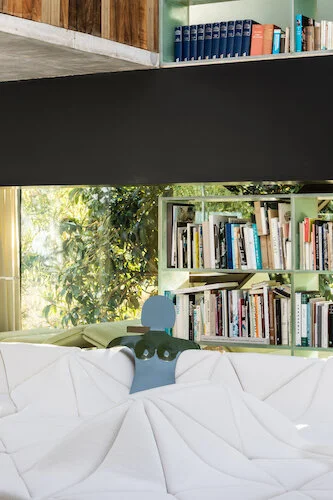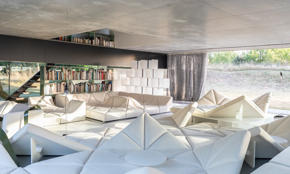 The layout of the smooth aluminum slabs on the ground is transformed to fit perfectly with the layout of the raised foam squares, creating a new moving floor, like a habitable landscape. Known for its minimalist and denuded spaces, the house has a new idea of comfort. It’s the transition from empty to full.